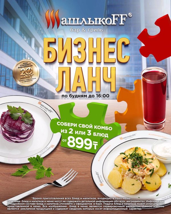 Чтобы дать хороший старт делам, надо хорошо подкрепиться! ⠀ Приглашаем Вас сегодня на бизнес — ланч! Сытное и разнообразное меню по приятной цене ждет Вас ежедневно по будням. ⠀ С заботой о Вас, Шашлыкоff ️ ⠀⠀⠀ Ауэзова, 43⠀⠀ 31-57-47, Керей Жанибек хандар, 12Б 47-28-21, Иманова, 52⠀⠀⠀ 57-41-63; ⠀