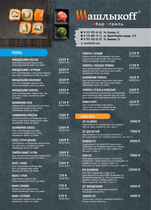 Бар & гриль «Шашлыкофф»⠀ ⠀ «ШашлыкоFF» – это заведение, которое не просто готовит мясо Мы знаем о нём всё ⠀ Именно поэтому мы являемся экспертами в приготовлении шашлыков, стейков и закусок ⠀ Сделав акцент на вкусе, качестве и сытности, мы сформировали наши принципы, которым неуклонно следуем уже несколько лет ⠀ ⠀ Только лояльные цены, непременно большие порции и всегда свежие продукты – это то, почему «ШашлыкоFF» любят во многих городах Казахстана и России ⠀ ⠀⠀⠀ Ауэзова, 43⠀⠀ , Керей Жанибек хандар, 12Б , ⠀