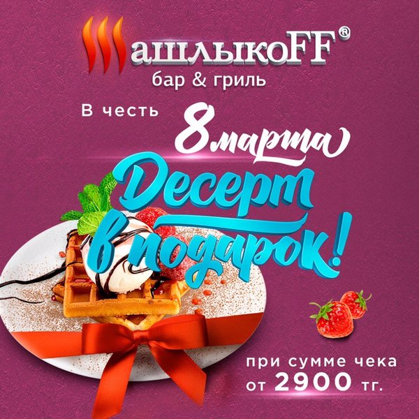 Милые девушки, в честь замечательного праздника 8 Марта, всей прекрасной половине десерт «Бельгийская вафля» в ПОДАРОК ⠀⠀ ⠀⠀ Акция действует при заказе от 2900 тг. Акция не суммируется с другими акциями, не действует на вынос и доставку. Подробности акции уточняйте у официанта* ⠀⠀ Ауэзова, 43⠀ , Керей Жанибек хандар, 12Б ,
