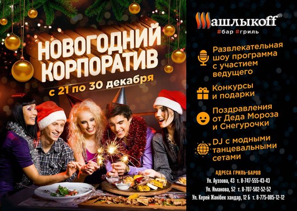 Новогодние корпоративы в гриль-баре «Шашлыкоff»!⠀ ⠀ Принимаем предзаказы до 30 человек. Количество посадочных мест ограничено. ⠀ ⠀⠀⠀ Успейте забронировать себе незабываемый сказочный праздник. ⠀⠀⠀ ⠀⠀⠀ Мини вечера будут проводиться по адресам:⠀⠀⠀ ⠀⠀⠀ Иманова, 52⠀⠀⠀ 57-41-63; ⠀ Ауэзова, 43⠀⠀ 31-57-47, ⠀ Керей Жанибек хандар, 12Б⠀ 47-28-21, ⠀ ⠀⠀⠀⠀⠀⠀⠀ Instagram: ⠀⠀⠀⠀⠀⠀⠀ @shashlikoff_kz⠀