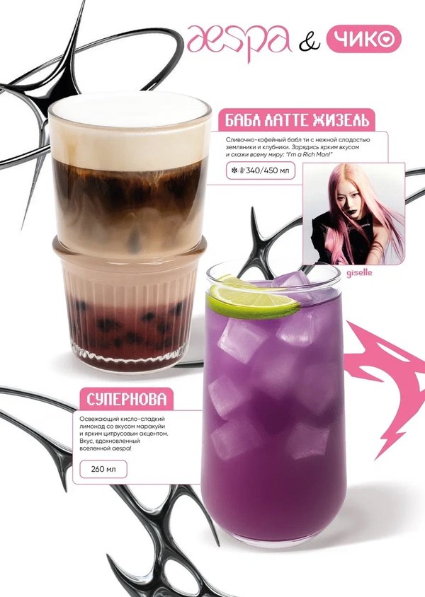 ИВЕНТ AESPA СТАРТОВАЛ! С 17 по 30 ноября Чико полностью в атмосфере aespa — новое меню, активности, карточки, подарки и много стильных деталей, которые мы подготовили специально к ивенту ЧТО ВАС ЖДЁТ: Новые блюда и напитки Интерактивы прямо в зале Новые карточки и стикеры Призы для самых активных Фанаты aespa, вы тут?