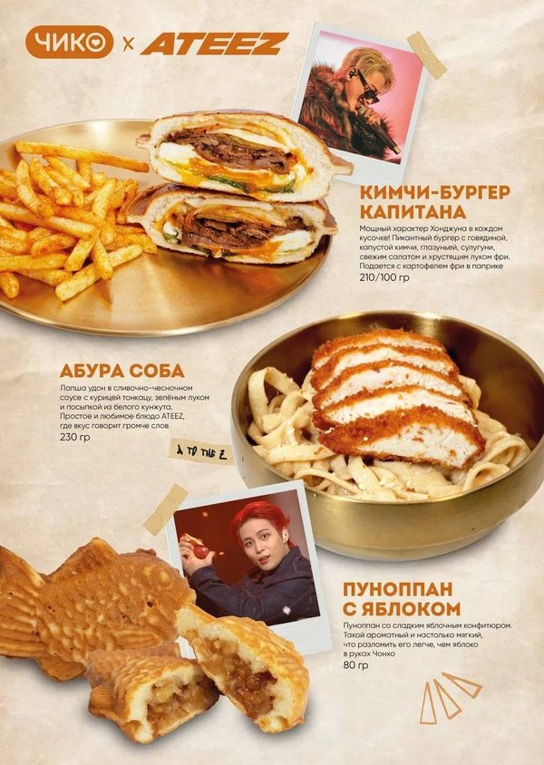 Новое меню с 20 октября! Ивент ATEEZ Ну что, друзья — дождались! Новый ивент в Чико уже стартовал. Тебя ждут розыгрыши подарков, новые блюда и напитки, а ещё та самая атмосфера, за которую мы все любим Чико! Кстати, бургер будет не во всех городах, поэтому уточняй его наличие в Telegram-канале или на кассе своего города. Полное меню уже прикрепили к посту!