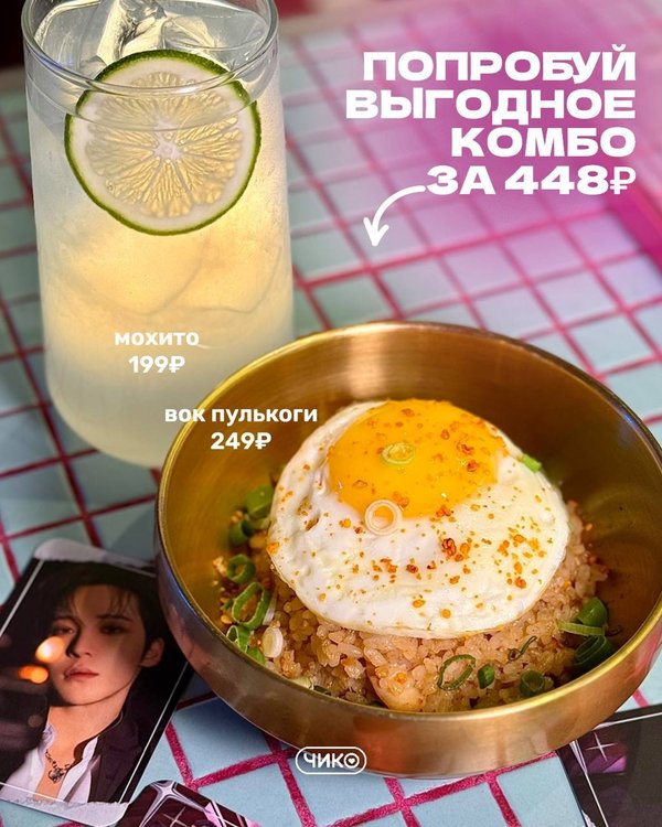 Вок пулькоги из меню Героев! Рис, обжаренный в фирменном соусе пулькоги с курицей, жареным яйцом и зелёным луком — настоящий вкус Азии в каждой ложке! Цена: Вок — 249₽ С лимонадом мохито — всего 448₽ за комбо! Это не акции, а новые цены! Заходи в Чико и попробуй сочно, пикантно и очень вкусно!