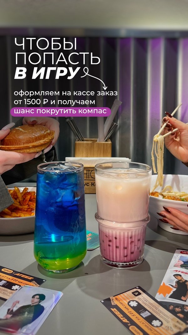 ATEEZ врываются в ЧИКО с 20 октября! С 20 октября по 2 ноября наши рестораны превращаются в настоящую зону приключений ATEEZ! Вас ждут эксклюзивные блюда, тематическая атмосфера и розыгрыши крутых призов! Сделай заказ от 1500 ₽ и получи возможность прокрутить волшебный Компас Удачи! Компас удачи — гарантированные подарки каждому гостю! Каждое вращение — это шанс забрать один из подарков: сертификаты на 500 чикоинов, эксклюзивные карточки, фирменные значки и другие классные призы от Чико! Ивент ATEEZ проходит с 20 октября по 2 ноября!