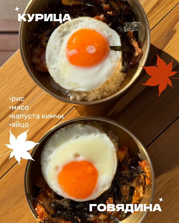 Новинка сезонного меню! Кимчи поккымпаб. Когда за окном становится прохладно, хочется чего-то тёплого, пряного и уютного. Кимчи поккымпаб — это яркое сочетание риса, кимчи, мяса и яица. Немного остроты, немного сладости — идеальный баланс! НА ВЫБОР -курица -говядина Совет: проткни сверху жареное яйцо, чтобы желток растёкся по рису — и смягчил вкус блюда.