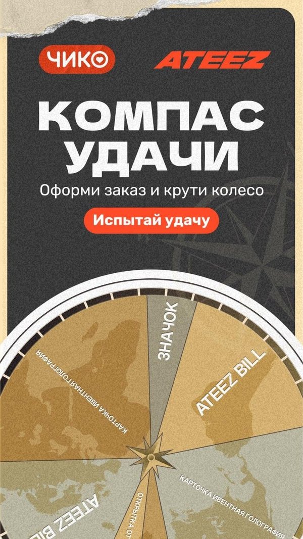 Компас удачи на ивенте ATEEZ до 2 ноября! Как принять участие: Нужно сделать заказ на кассе от 1500 ₽, чтобы получи возможность прокрутить специальное колесо. Каждое вращение — это шанс забрать один из крутых подарков: сертификат на 500 чикоинов, эксклюзивные карточки, фирменные значки, и другие классные призы от Чико!