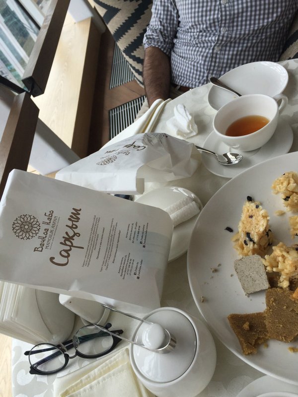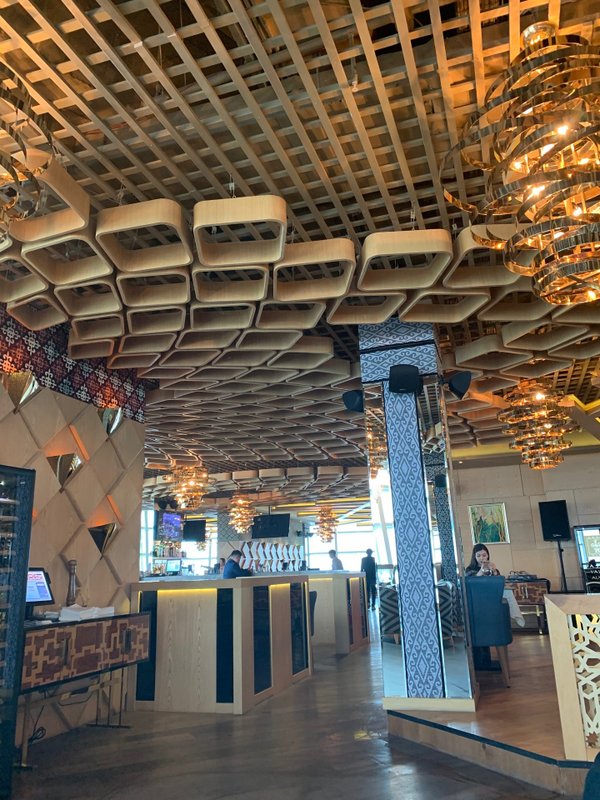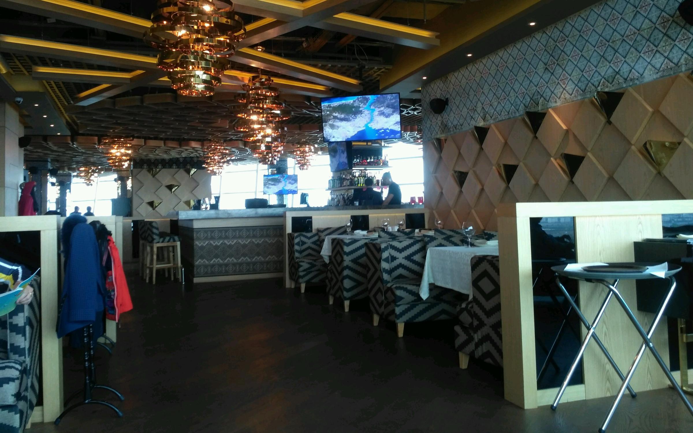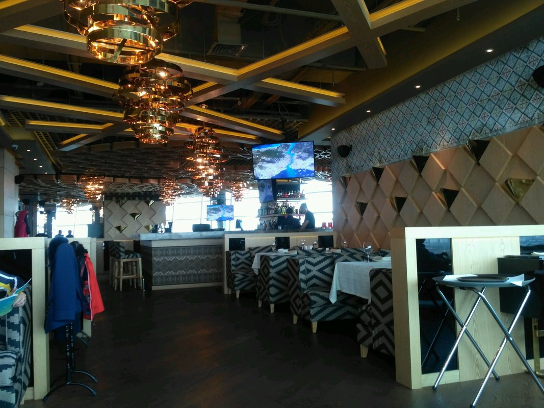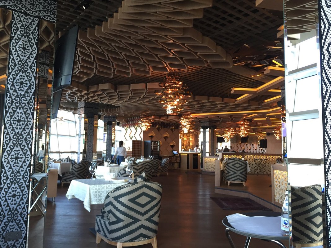 Панорамный вид с 25 этажа, куда поднимаешься на стеклянном панорамном лифте. Очень вкусная еда из 9 кухонь тюркоязычных народов по приемлемым ценам. Коктейли при этом достаточно средние.