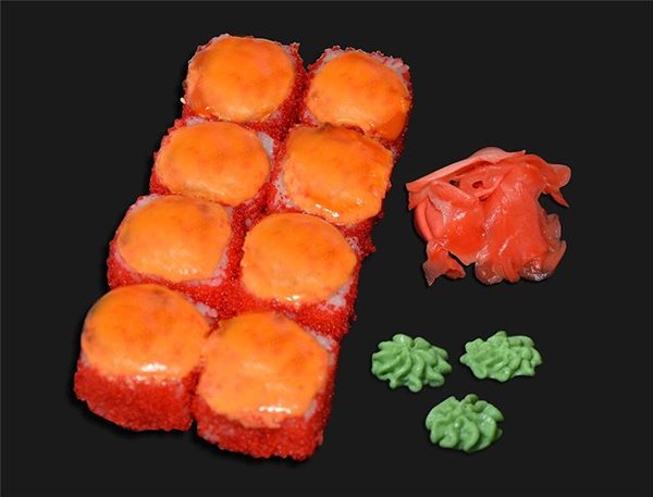 В новом амплуа с креветкой, икрой тобико и листом салата. Цена 1200 тенге. Заказать можно на нашем сайте или по телефону.