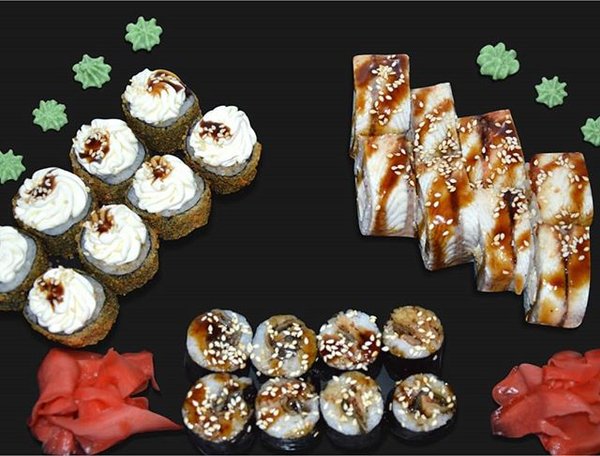 Ассорти из 3 роллов с угрем: Ролл Дракон 8 шт., Ролл Унаги Маки 8 шт., Ролл Унаги темпура 8 шт. Заказать можно на сайте или по тел: