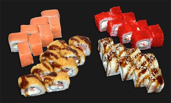 1. Гейша: Филадельфия, Калифорния, Аляска, Бонито, Эби Темпура, Сяке маки, Унаги маки. 7700 тг.