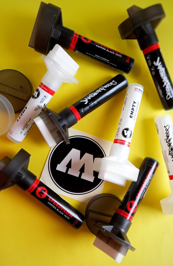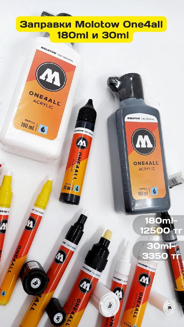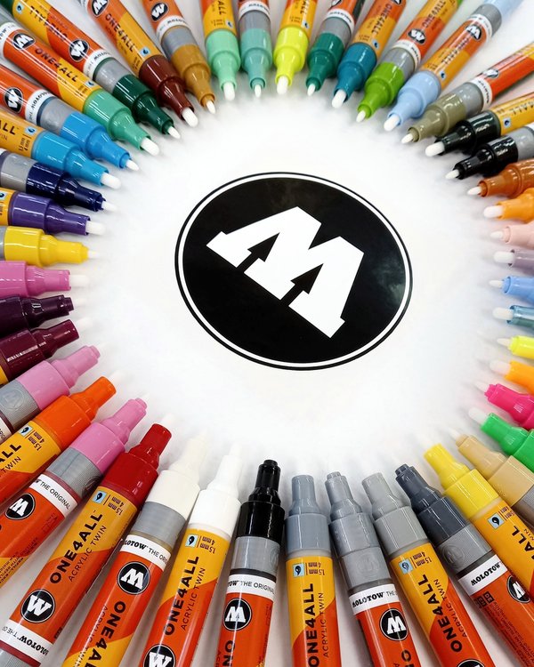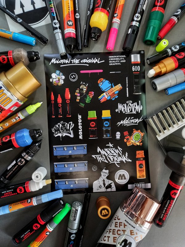 оптимизированы для граффити — меньше пыли при распылении, чёткие края линий и баллоны без шариков для смешивания. С первым в мире аэрозолем без шариков для смешивания родился бренд MOLOTOW ™️, и его логотип впервые был на обратной стороне этикетки. До сегодняшнего дня этот аэрозольный баллончик является эталонным продуктом Дальнейшие инновации не заставили себя долго ждать, и родился первый аэрозольный баллон для аккуартного граффити искусства — MOLOTOW ™️ PREMIUM. MOLOTOW™️ начал активно выпускать маркеры сравнительно недавно, только в 2012 году. На сегодняшний день маркеры немецкого бренда занимают уверенное место на полках всех граффити магазинов. Производители до сих пор не перестают удивлять фанатов бренда новинками, из последних можем выделить — линейку маркеров Liquid Chrome с заправкой «жидкое стекло», восковые маркеры Scrawl Stick с грифелем 30(!) мм и линейку маркеров-кистей с мягким корпусом — AQUA Squeeze Pen. Бренд MOLOTOW™️ позволяет воплотить любые идеи в жизнь. Каждый найдет то, что ищет. MOLOTOW™️ — в самое сердце ️