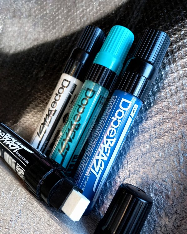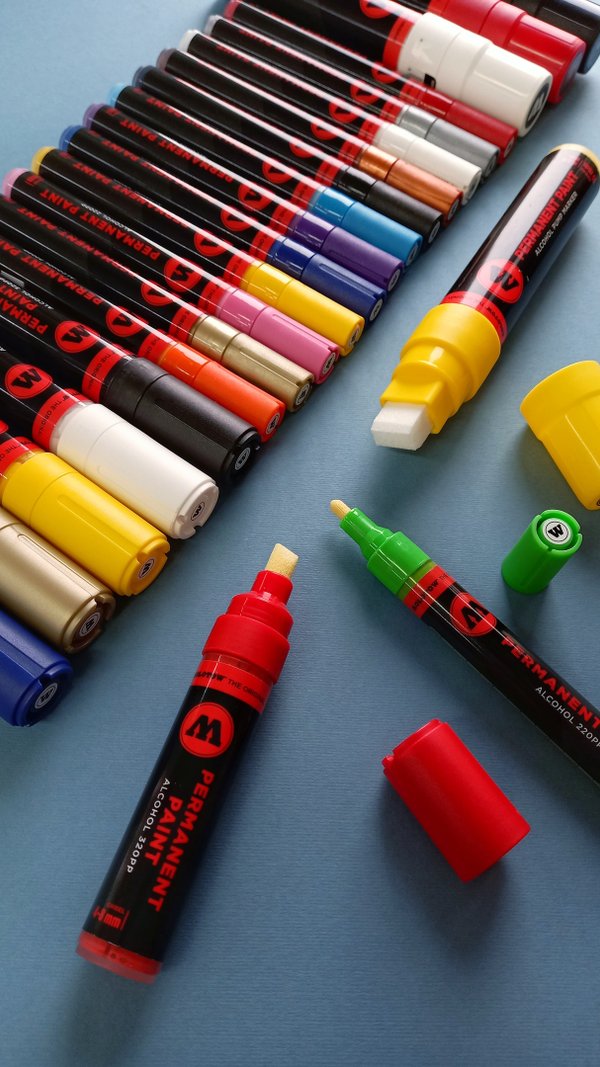 Самый большой маркер в линейке Molotow, он дает возможность быстро работать по большим поверхностям без потери качества. Линия имеет ширину до 60 мм, но благодаря восьмиканальной системе и особому клапану чернила ложатся равномерно и плотно, да к тому же и без подтеков.