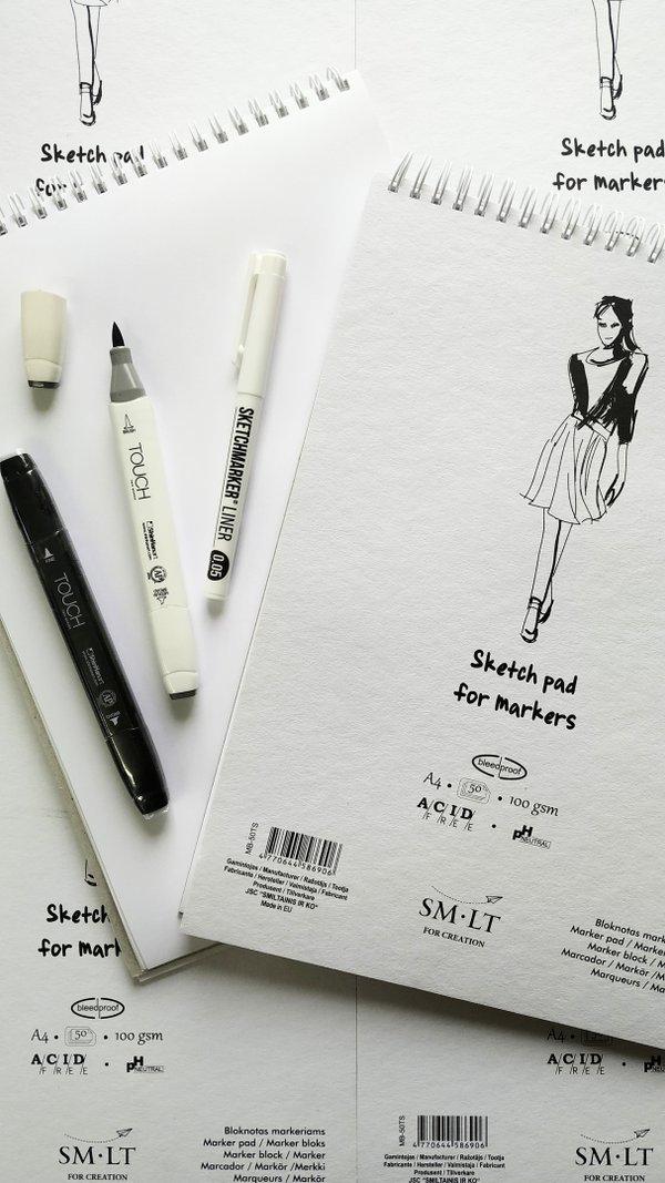 Эта линейка скетчбуков создана специально с акцентом на спиртовые маркеры. Однако, брашпены, тушь, ручки также отлично будут ложиться и взаимодействовать с этой бумагой.