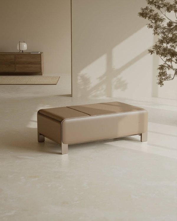 Интерьерный массажер для ног в коллекции Healthterior. Нажатием одной кнопки массажная панель открывается под углом в 30 градусов — такое положение способствует оттоку крови, снимая отеки, усталость и напряжение в мышцах. После сеанса модель преобразуется в пуф. Подробности — в приложении, на сайте и в бутиках.