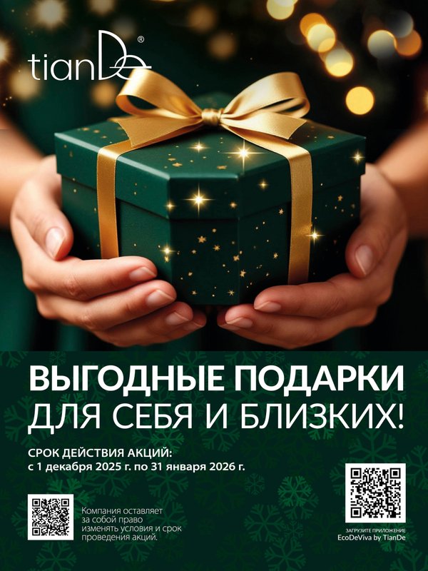 тела, продукты для здоровья – подарите своим родным и друзьям не просто вещь, а частичку заботы и красоты! Время сиять – преображаемся к празднику! Новый год – это не только подарки, но и возможность выйти в свет во всей красе! Поэтому не забываем о себе любимых! Хотите встретить праздник с сияющей, свежей кожей? Попробуйте экспресс-варианты ухода – маски для лица от TianDe! Они помогут освежить цвет лица, разгладить мелкие морщинки и вернуть коже упругость и тонус. Всего несколько недель использования (сделайте курс масок), и вы удивитесь, как быстро ваша кожа преобразится! — Корректирующая маска для лица «Интенсивный лифтинг» — Кристальная коллагеновая маска для век — Крем-маска ночная с зеленым чаем — Крем-маска ночная с мушмулой — Восстанавливающая ночная крем-маска для лица с пробиотиками — Маска для лица с азелаиновой кислотой и витамином С Не забывайте и о теле! Питательные кремы/лосьоны – все это поможет вам почувствовать себя настоящей королевой! — Лосьон для тела SOD — Гиалуроновый гель-лосьон для лица и тела с морскими водорослями Не откладывайте на потом – создайте свой идеальный образ к Новому году уже сейчас! Пусть этот месяц станет для вас временем волшебства, заботы о себе и близких. Что еще успеть за этот волшебный месяц? — Планируем праздник! Продумайте меню, составьте список гостей, решите, где и как вы будете отмечать. — Создаем новогоднее настроение! Украсьте дом, включите любимые рождественские фильмы, слушайте праздничную музыку. — Подводим итоги! Вспомните все хорошее, что произошло за год, и отпустите все лишнее. — Загадываем желания! Ведь Новый год – это время, когда сбываются самые заветные мечты! Пусть это время будет наполнено радостью, предвкушением праздника и, конечно же, красотой! У вас есть все шансы встретить Новый год во всей красе и с подарками, которые будут радовать! А вы уже начали подготовку к Новому году? Делитесь в комментариях! А мы напоминаем, что канал TianDe теперь и на платформе MAX! Присоединяйтесь по ссылке, чтобы быть в курсе всего самого интересного!