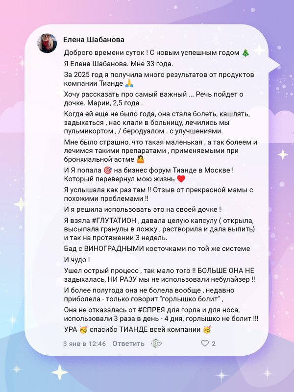 рямого эфира пишите свои отзывы, истории использования продуктов линии здоровья TianDe. Что вам помогает восстановиться после праздников. 2) Продукты, о которых желательно писать отзывы: фосфолипидный фактор, БАД для пищи «Расторопша с рибофлавином», фиточаи TianDe, напиток «Артишок и барбарис», очищающий напиток на настое антипаразитарных растений и другие продукты линии здоровья. 3) Комментарии должны быть осмысленными и не менее 40 символов. ВАЖНО! Пожалуйста, пишите свой возраст, по возможности прикрепляйте фото (до/после). 4) Писать отзывы нужно до 13:00 19 января 2026 года. 5) Все отзывы лично прочитает к.м.н. Марина Одинцова и выберет трех победителей. 6) Имена победителей будут озвучены 20 января 2026 года в рамках прямого эфира в рубрике «ПРО Здоровье». 7) Победители получат по 500 рублей на бонусный счет! Ваши отзывы ждем здесь #КарусельОтзывов_De Канал TianDe на платформе MAX! Присоединяйтесь по ссылке: