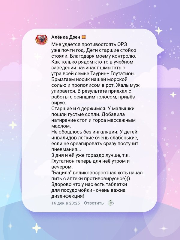 ариях к записи прямого эфира пишите свои отзывы, истории использования продуктов линии здоровья TianDe, которые помогли защитить организм от вирусов, и облегчить состояние и восстановлении про ОРВИ. 2) Продукты, о которых желательно писать отзывы: БАД к пище: «Глутатион комплекс», «Чага и мумие», Vital Fucoidan, пектиновые кисели, белковые коктейли, гигиенические спреи и другие продукты линии здоровья. 3) Комментарии должны быть осмысленными и не менее 40 символов. ВАЖНО! Пожалуйста, пишите свой возраст, по возможности прикрепляйте фото (до/после). 4) Писать отзывы нужно до 13:00 8 декабря 2025 года. 5) Все отзывы лично прочитает к.м.н. Марина Одинцова и выберет трех победителей. 6) Имена победителей будут озвучены 9 декабря в рамках прямого эфира в рубрике «ПРО Здоровье». 7) Победители получат по 500 рублей на бонусный счет! Ваши отзывы ждем здесь