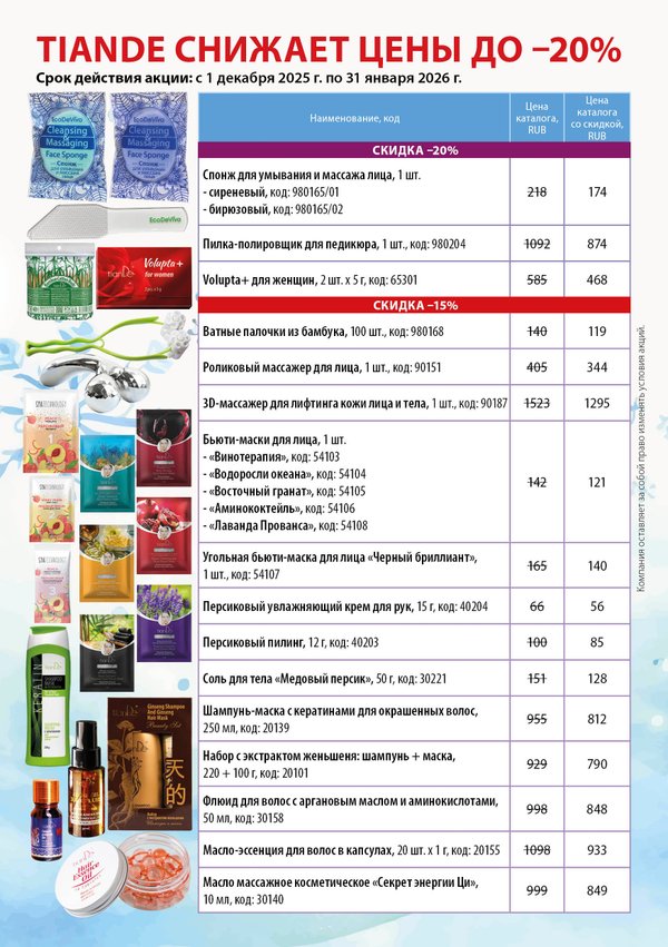Пора исполнить свои бьюти-желания! То, что вы откладывали на потом, теперь доступно с выгодой! В TianDe скидки до – 20% на самые популярные продукты! Это ваш шанс обновить арсенал средств для ухода за волосами, подарить коже лица и тела идеальное преображение и многое другое. А еще – это идеальное время, чтобы позаботиться о подарках для близких к грядущим праздникам! Спешите за покупками прямо сейчас: Канал TianDe на платформе MAX! Присоединяйтесь по ссылке: