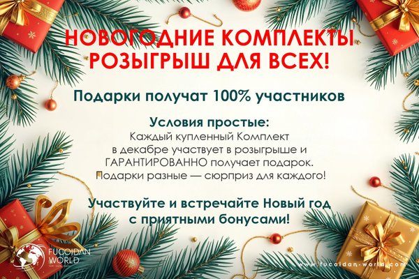 НОВОГОДНИЕ КОМПЛЕКТЫ РОЗЫГРЫШ ДЛЯ ВСЕХ! Подарки получат 100% участников Условия простые: • Каждый купленный Комплект в декабре • участвует в розыгрыше • и ГАРАНТИРОВАННО получает подарок Подарки разные — сюрприз для каждого! Участвуйте и встречайте Новый год с приятными бонусами! Подробнее в Telegram -канале: Fucoidanworld_official Ссылка на Telegram -группу :