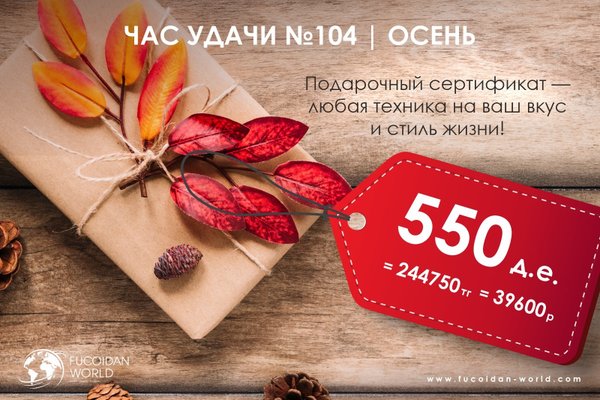 Час удачи № 104 | ОСЕНЬ Осень — время тёплых эмоций и приятных сюрпризов! А в компании Fucoidan World — это ещё и время подарков Дарим подарочный сертификат на 550 д.е. Выбирай любую технику на свой вкус и стиль жизни — всё, что делает твой дом уютным, а жизнь комфортной! 550 д.е. = 244 750 ₸ = 39 600 ₽ Сделай эту осень особенной — участвуй, выигрывай и выбирай то, что тебе действительно нужно! Правила участия: Счастливая обладательница сертификата розыгрыша № 103 за сезон Лето — Сейдахметова Жанар! Радуйтесь вместе с нами!