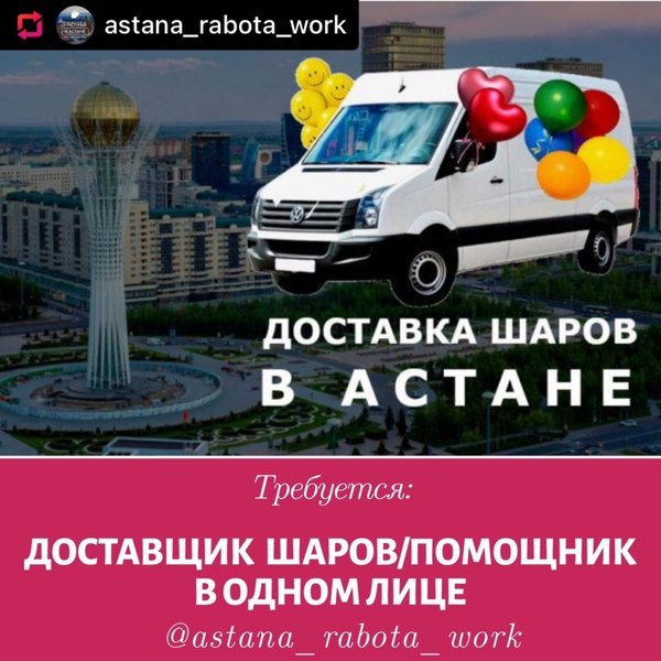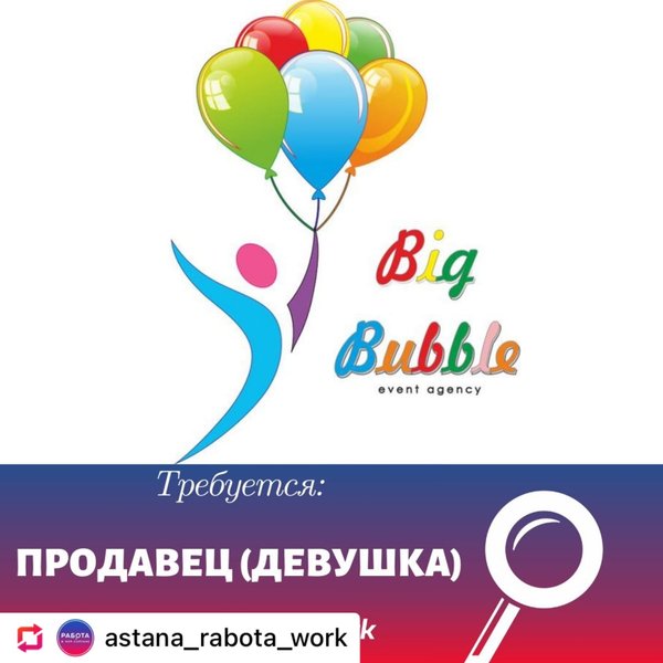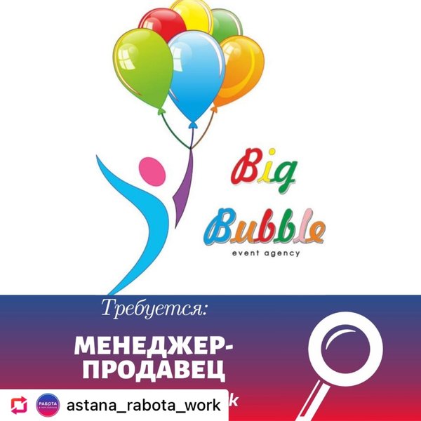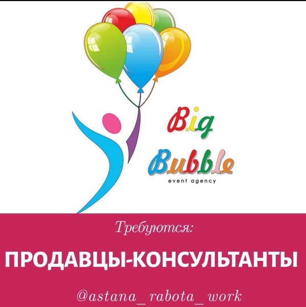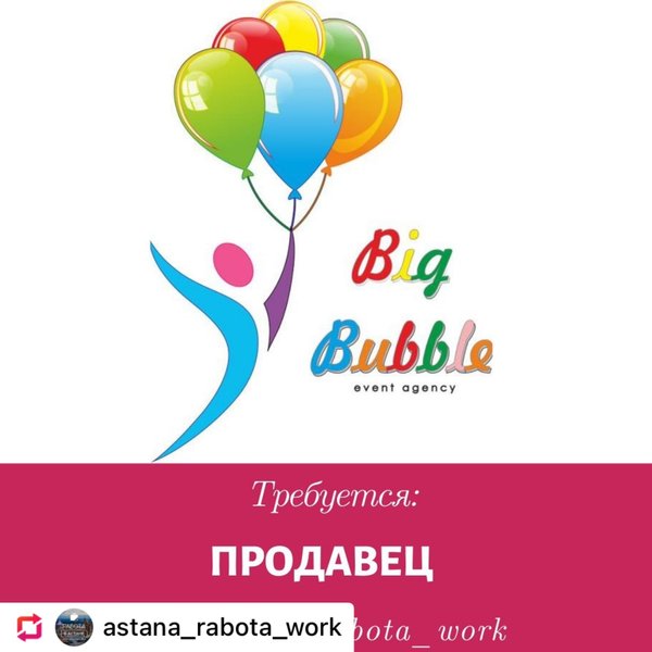 Dauka Mukhamejan (04.05.2021): #Repost with @fastsave_photo_video credit: @astana_rabota_work В магазина шариков и все для праздника требуется девушка продавец Возраст от 18 до 30лет девушки Желательно с опытом Всему научим ⠀ Instagram @bigbubble_astana График 2/2, с 9—00 до 00—00 Развозка есть Зп 100.000 -150.000 Оклад +%%% ⠀ Нужно будет: — готовить заказы — прием и учет товаров — консультация покупателей — учет кассы — соблюдения чистоты и порядка — разивавться и учиться ⠀ На собеседование пишите ватсап Адрес Майлина 14 Bigbubble