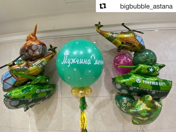 Dauka Mukhamejan (06.05.2021): ️Камуфляжные шары, танки, камуфляжные звездочки, вертолёт, военный Хаммер и многое другое вы можете приобрести у нас в @bigbubble_astana ️ ️ —————— Доставка 24/7 —————— ️Самовывоз с 09—00 до 23—45 ️Майлина 14
