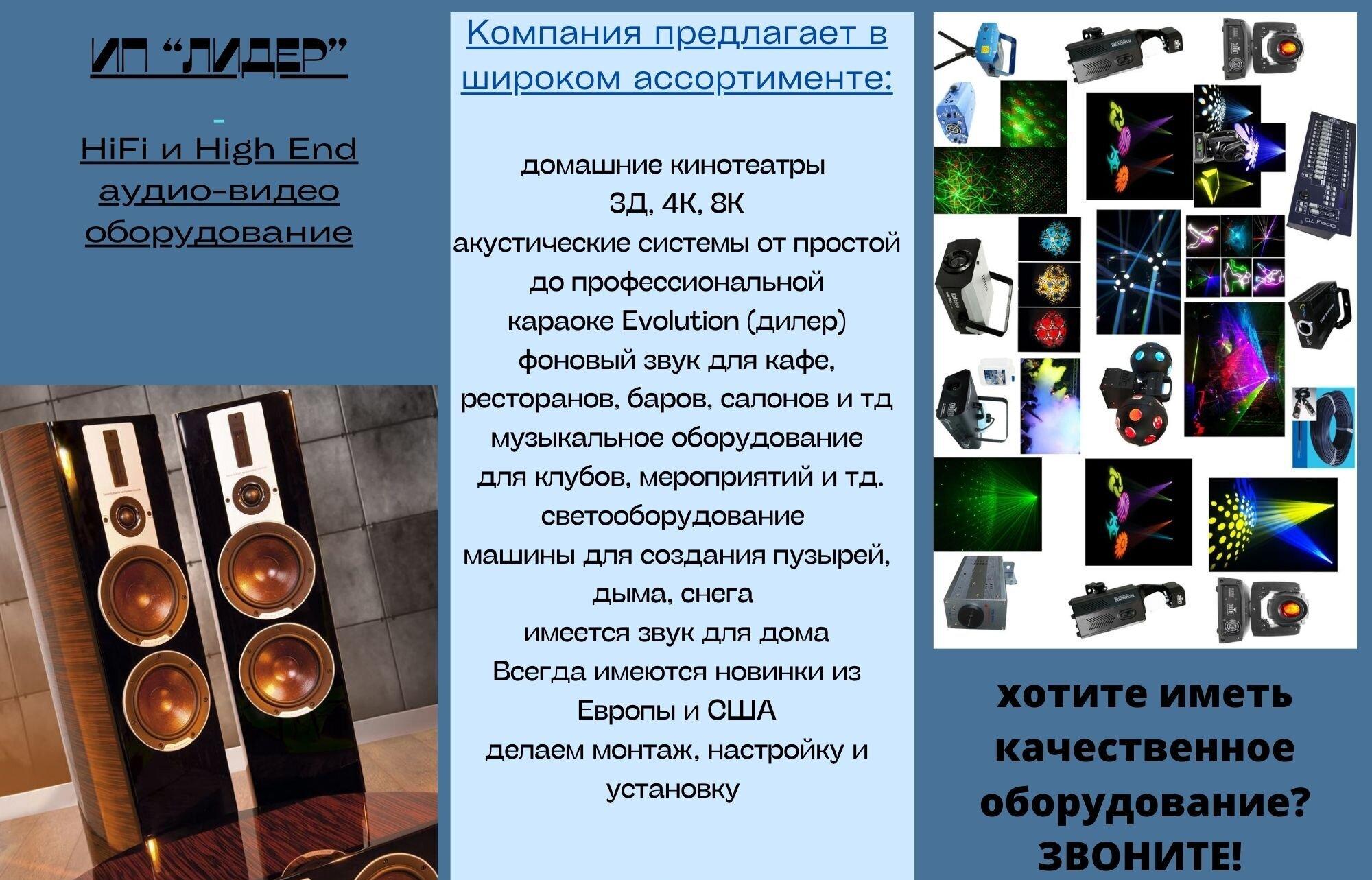 Компания «ЛИДЕР» предлагает вам полный спектр услуг в сфере аудио- видео оборудования. Сотрудники нашей компании имеют соответствующую квалификацию и большой опыт работы в данной деятельности. Компания на рынке с 2009 года. Имеем много довольных клиентов по всему Казахстану!