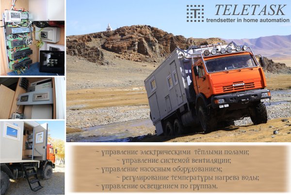 Сегодня представляем Вашему вниманию очень интересный проект, который наши партнеры TELETASK Тюмень (Россия) осуществили на оборудовании TELETASK. Наше оборудование было установлено на .. КАМАЗе!!!! Удивительно! Даже сложно назвать этот дом на колесах автомобилем! На нем уже совершили путешествие в Монголию! В таком сложном и опасном путешествии, оборудование зарекомендовало себя с лучшей стороны! Желаем нашим партнерам удачи и побольше интересных проектов! Был осуществлен следующий функционал: — управление освещением; — управление теплым поло… — Читать дальше