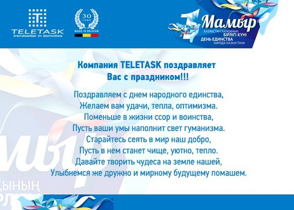 Вся команда TELETASK поздравляет Вас с Днём Независимости Республики Казахстан От чистого сердца желаем Вам процветания в делах, достижения новых успехов, благополучия в Ваших домах и гармонии в семье!