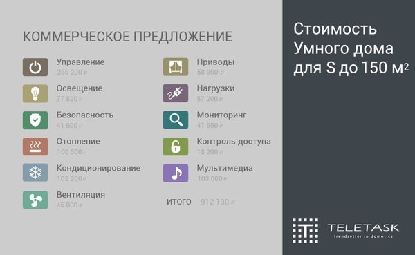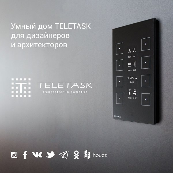 гли еще активнее болеть за любимую команду. 2. После вечеринки с друзьями уборщица придет навести порядок. Разрешите доступ в Вашу квартиру с помощью приложения и там же просматривайте изображение с видеокамеры. 3. В долгих поездках и командировках все инженерные системы Вашего дома или квартиры будут под контролем 24/7 в режиме онлайн. Получайте оповещения по смс и e-mail в случае непредвиденных аварийных ситуаций. 4. Планируете провести вечер с девушкой? Активируйте сценарий “Романтика” — одно нажатие кнопки и приглушается свет, зажигается камин, включается романтичная музыка и многоцветная подсветка…и, возможно, холостяком Вы останетесь не так долго. 5. Благодаря по умолчанию заложенным функциям экономии электроэнергии, система TELETASK поможет сэкономить. А сэкономленные средства Вы сможете потратить на свидания или новые путешествия.