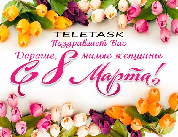 Компания TELETASK от всей души поздравляет милых дам с прекрасным праздником 8 МАРТА! Восьмое марта — праздник мировой, Его везде достойно отмечают. А это значит, что прекрасный пол Во всех народах любят, уважают.