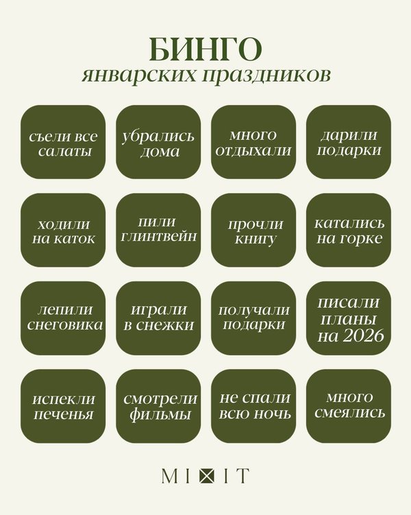Первые дни 2026: бинго Неважно, сколько получилось галочек — главное, чтобы эти дни были максимально полезными для вас. Отдыхали активно или просто отдыхали — всё считаем победой! Отмечайте, что успели сделать за январские праздники