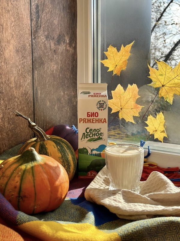 Күздің жылы күні, көрпе, асқабақ және стақан био-ряженкасы «Село Лесное СМ. Одан артық не болуы мүмкін? Бай, жеңіл карамель дәмі бар, био-ряженка, жай сәттер мен табиғи дәмді ұнататындар үшін жасалған. Тёплый осенний день, плед, тыквы и стакан био-ряженки ТМ «Село Лесное. Что может быть уютнее? Насыщенная, с лёгким карамельным вкусом, био-ряженка, создана для тех, кто любит неспешные моменты и натуральный вкус.
