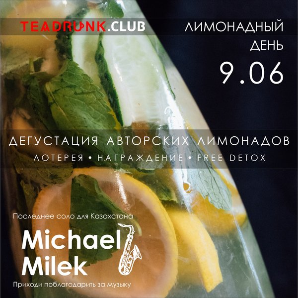 — не ограничено! p.s. чем больше билетов, тем больше шансов на выигрыш! Музыкальным сопровождением станет прощальное соло для Казахстана от саксофониста с мировым именем MICHAEL MILEK под аккомпанемент грувбокса. Михаил играл для Германии, США, Израиля, Узбекистана и Казахстана. Теперь, ему снова пора в путь, нести музыку людям! Приходите поблагодарить музыканта! Все собранные средства будут переданы Михаэлю для его дальнейшего путешествия.