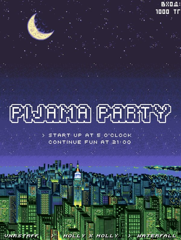 Pijama Party — Старт: Только пижамы, только Хардкор. Формат входа «Пижамно-халатный»: пижамы, халаты, пледы, тапочки, тапочки с котами, халаты с уточками, пижамы с зайцами и т.д. Начало в 5 часов. Вход: 1000тг