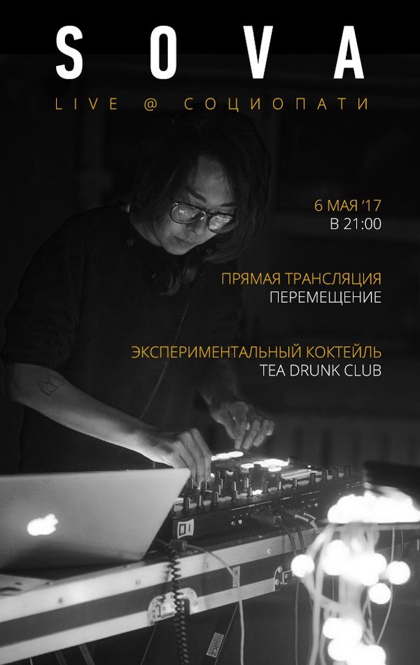 6 МАЯ / СОЦИОПАТИ / ПРЯМАЯ ТРАНСЛЯЦИЯ Музыкальная Онлайн Вечеринка Визуальное Сопровождение Экспериментальный Чайный Энергетический Коктейль Мероприятие публика которого состоит из друзей и друзей друзей организаторов Line-up: SOVA Mr. X