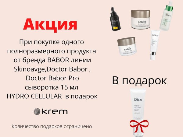 Радуем вас нашей приятной летней акцией — при покупке одного полноразмерного продукта от бренда BABOR линии Skinoavge,Doctor Babor, Doctor Babor Pro сыворотка 15 мл HYDRO CELLULAR В ПОДАРОК Данная сыворотка подойдёт для всех типов кожи Количество подарков ограничено, торопитесь!