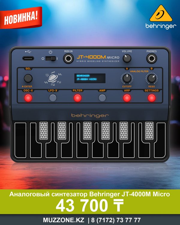 хновлён культовым JP‑8k и его знаковой формой волны Supersaw, обеспечивающей широчайшее, плотное и воздушное звучание, любимое миллионами продюсеров и исполнителей. Но это ещё не всё! Синтезатор оснащён функцией «усадочного луча», дающей ещё более насыщенные и живые тембры. А 32 ячейки памяти позволяют сохранять свои лучшие пресеты и возвращаться к ним в один клик Тёплый аналоговый звук. Без лишнего веса. Аутентичный 12-битный ЦАП и многорежимный аналоговый фильтр делают звучание синтезатора по-настоящему винтажным и насыщенным. Это тот самый аналоговый характер, который вы искали — теперь в компактной форме, готовой к путешествиям и джемам в любом пространстве! Умный контроль. Сенсорная клавиатура. Бесконечные возможности. Управлять этим синтезатором — настоящее удовольствие. Ультрачувствительная 16-кнопочная сенсорная клавиатура даёт полный контроль над исполнением. Встроенные огибающие фильтра и усилителя, а также два LFO позволяют скульптурировать тембр, создавать драматические пульсации и атмосферные модуляции. Всё в ваших руках — без границ для творчества! MIDI по USB, встроенный арпеджиатор, лёгкая интеграция в любую цифровую или аналоговую систему. JT‑4000M MICRO — это отдельный мир звука в вашей ладони. Он подходит новичкам, которые хотят начать свой путь с чего-то особенного, и опытным музыкантам, которым нужен надёжный портативный помощник Behringer JT‑4000M MICRO — не просто инструмент. Это ваше воображение и вдохновение. Компактный, доступный, гениальный! Уже в продаже! Не упустите возможность — добавьте в свой сетап то, что сделает ваш звук еще более интересным! Действует рассрочка Для оформления заказа переходите по ссылке на наш сайт или приходите в наш магазин по адресу ул. Кажымукана 14 ___________________ ДОСТАВКА по РК и СНГ По всем вопросам:, 35-01-45 ⏰График работы: с 10:00 до 19:00 Пн-Пт; с 10.00 до 17.00 Сб; Вс — выходной Сайт: muzzone.kz Почта: info@muzzone.kz ▶YouTube канал «МузZone Астана»
