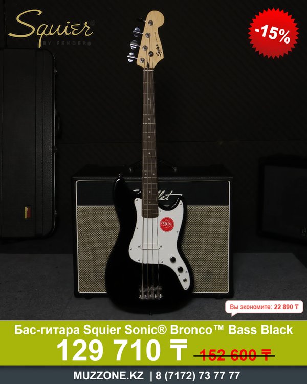 и самых быстрых техниках Короткая мензура 30”: идеально для начинающих и музыкантов с небольшими руками: низкое натяжение струн и легкость при игре Надежность: бридж с 4 стандартными седлами и литые колки закрытого типа для стабильного строя Винтажная атмосфера: ощущение фирменного стиля Fender® 50-х и 60-х годов ️ Squier Sonic® Bronco™ Bass Black — это компактная, стильная и универсальная бас-гитара, которая вдохновит вас на новые треки и энергичные выступления! Готовы зазвучать громко и ярко? Действует скидка -15% Для оформления заказа переходите по ссылке на наш сайт: или приходите в наш магазин по адресу ул. Кажымукана 14 _______________________________________________________ ДОСТАВКА по РК и СНГ По всем вопросам:, 35-01-45 ⏰График работы: с 10:00 до 19:00 Пн-Пт; с 10.00 до 17.00 Сб; Вс — выходной Сайт: muzzone.kz Почта: info@muzzone.kz ▶YouTube канал «МузZone Астана»