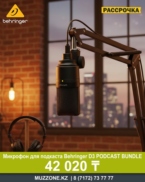 ение Plug-and-Play — никаких драйверов, запись в одно касание Регулируемый пантограф — удобно фиксирует микрофон и держит его в кадре Поп-фильтр в комплекте — убирает резкие «п» и «б», делая голос мягким Идеален для подкастов, стримов и игр — готов к работе с первой минуты Полная комплектация: микрофон, кабель USB-C, пантограф, держатель, поп-фильтр. Behringer D3 Podcast Bundle — ваш голос, ваша студия, ваши правила. Начните звучать по-настоящему профессионально уже сегодня! Действует рассрочка Для оформления заказа переходите по ссылке на наш сайт: или приходите в наш магазин по адресу г.Астана, ул. Кажымукана 14 _____________________________________________________________________ ДОСТАВКА по РК и СНГ По всем вопросам:, 35-01-45 ⏰График работы: с 10:00 до 19:00 Пн-Пт; с 10.00 до 17.00 Сб; Вс — выходной Сайт: muzzone.kz Почта: info@muzzone.kz ▶YouTube канал «МузZone Астана»