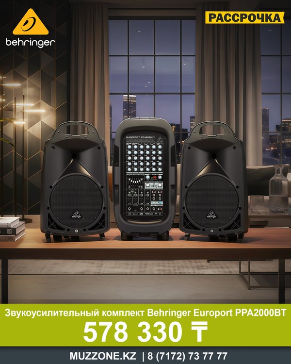 ру минут! Всё включено: микрофон профессионального уровня, все нужные кабели и аксессуары — всё в комплекте! 8-канальный микшер с фантомным питанием +48В, 4 микрофонных входа, 2 инструментальных и MP3-вход Эффекты мирового класса от KLARK TEKNIK — 100 пресетов: реверберация, хор, дилэй, флэнджер и другие FBQ Feedback Detection System — забудьте про наводки и шум! Система сама покажет, какой фейдер нужно понизить Bluetooth и беспроводные возможности: подключайте iPhone, iPad или микрофоны серии ULTRALINK без проводов! Удивительное соотношение мощности и веса: лёгкая, но звучит как студийная система Полный контроль над звуком: встроенный графический эквалайзер, фильтр низких частот, стерео Aux-входы В комплекте вы получаете: Микрофон BEHRINGER XM1800S Микрофонный держатель Кабели для подключения Прочный кейс с отделением для аксессуаров EUROPORT PPA2000BT — идеальна для: Вечеринок Свадеб и корпоративов Семинаров и школ Пресс-конференций и мероприятий Потрясающий звук. Мгновенная установка. Профессиональные эффекты. Действует рассрочка Для оформления заказа переходите по ссылке в шапке профиля! MUZZONE.KZ или приходите в наш магазин по адресу г.Астана, ул. Кажымукана 14 ___________________ ДОСТАВКА по РК и СНГ По всем вопросам:, 35-01-45 ⏰График работы: с 10:00 до 19:00 Пн-Пт; с 10.00 до 17.00 Сб; Вс — выходной Сайт: muzzone.kz Почта: info@muzzone.kz Эта звуковая система превращает любое место — в сцену, любое мероприятие — в шоу! EUROPORT PPA2000BT — ваш личный концерт в чемодане! 2000 Ватт кристально чистого звука, профессиональные эффекты от KLARK TEKNIK, защита от обратной связи и полная мобильность - всё, что нужно для идеального звука в одной коробке ТОП особенностей: 2000 Вт чистой мощности: звук, который заполняет помещение и остаётся кристально ясным даже на максимуме Компактность и мобильность: система складывается в кейс-портфель с ручкой. Настройка занимает всего пару минут! Всё включено: микрофон профессионального уровня, все нужные кабели и аксессуары — всё в комплекте! 8-канальный микшер с фантомным питанием +48В, 4 микрофонных входа, 2 инструментальных и MP3-вход Эффекты мирового класса от KLARK TEKNIK — 100 пресетов: реверберация, хор, дилэй, флэнджер и другие FBQ Feedback Detection System — забудьте про наводки и шум! Система сама покажет, какой фейдер нужно понизить Bluetooth и беспроводные возможности: подключайте iPhone, iPad или микрофоны серии ULTRALINK без проводов! Удивительное соотношение мощности и веса: лёгкая, но звучит как студийная система Полный контроль над звуком: встроенный графический эквалайзер, фильтр низких частот, стерео Aux-входы В комплекте вы получаете: Микрофон BEHRINGER XM1800S Микрофонный держатель Кабели для подключения Прочный кейс с отделением для аксессуаров EUROPORT PPA2000BT — идеальна для: Вечеринок Свадеб и корпоративов Семинаров и школ Пресс-конференций и мероприятий Потрясающий звук. Мгновенная установка. Профессиональные эффекты. Действует рассрочка Для оформления заказа переходите по ссылке на наш сайт: или приходите в наш магазин по адресу г.Астана, ул. Кажымукана 14 ______________________________________________________________________ ДОСТАВКА по РК и СНГ По всем вопросам:, 35-01-45 ⏰График работы: с 10:00 до 19:00 Пн-Пт; с 10.00 до 17.00 Сб; Вс — выходной Сайт: muzzone.kz Почта: info@muzzone.kz