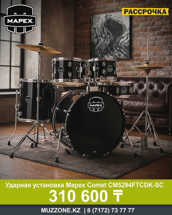 енным диапазоном Полный комплект тарелок: 14» хай-хэт и 16» крэш, готовые к игре сразу после распаковки Вся фурнитура в комплекте: стойки, педаль и даже удобный стульчик барабанщика Состав установки: Бас-барабан: 22» x 16» Малый барабан: 14» x 5» Томы: 10» x 7» и 12» x 8» Напольный том: 16» x 14» Тарелки: 14» хай-хэт, 16» крэш Фурнитура: C250, S250, P250, H250, T400 Mapex Comet Dark Black — это ваш билет в мир яркого, профессионального звучания! Действует рассрочка Для оформления заказа переходите по ссылке на наш сайт: или приходите в наш магазин по адресу ул. Кажымукана 14 _______________________________________________________ ДОСТАВКА по РК и СНГ По всем вопросам:, 35-01-45 ⏰График работы: с 10:00 до 19:00 Пн-Пт; с 10.00 до 17.00 Сб; Вс — выходной Сайт: muzzone.kz Почта: info@muzzone.kz ▶YouTube канал «МузZone Астана»