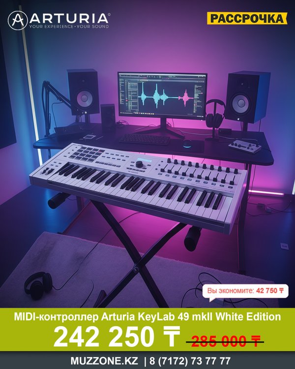 ком: 16 пэдов с RGB-подсветкой, 9 фейдеров и 9 регуляторов Гибкость подключения: USB, MIDI, CV/Gate, педали и интеграция с вашей DAW Готов к сцене и студии: прочный алюминиевый корпус и продуманный интерфейс Интеллектуальное управление: пресеты для популярных DAW + магнитные накладки с подсказками Вдохновляющие инструменты в комплекте Analog Lab — более 6500 звуков легендарных синтезаторов, пианино, органов и других клавишных Piano V — 12 фортепиано мирового класса с магией физического моделирования Ableton Live Lite — популярная платформа для записи и создания музыки без ограничений Ваш персональный MIDI-помощник: KeyLab MkII легко интегрируется с любой популярной DAW: от Pro Tools и Logic до Ableton и FL Studio. Настраивайте всё под себя — от пэдов до педалей, от фейдеров до автоматизации. Хотите управлять Eurorack, синтезаторами и виртуальными инструментами одновременно? С этим контроллером это проще, чем когда-либо! KeyLab MkII — это инструмент, который раскрывает ваш творческий потенциал! Создавайте музыку свободно, с удовольствием и на профессиональном уровне Действует рассрочка Для оформления заказа переходите по ссылке на наш сайт: В белом цвете: В черном цвете: или приходите в наш магазин по адресу г.Астана, ул. Кажымукана 14 _______________________________________________ ДОСТАВКА по РК и СНГ По всем вопросам:, 35-01-45 ⏰График работы: с 10:00 до 19:00 Пн-Пт; с 10.00 до 17.00 Сб; Вс — выходной Сайт: muzzone.kz Почта: info@muzzone.kz ▶YouTube канал «МузZone Астана»