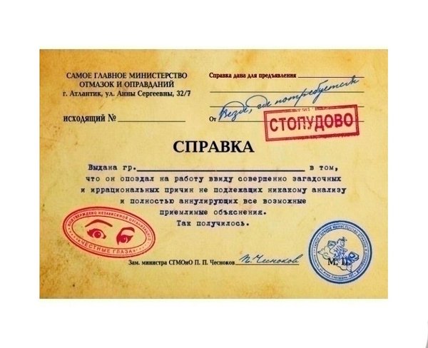 Самое главное министерство отмазок и оправданий представляет! Справки на различные случаи жизни, для предоставления по месту требования. Официально!