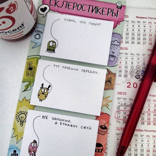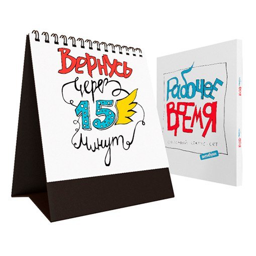 Внимание, новая порция офисной запрещенки! Набор статусов-посланий для коллег и клиентов «Рабочее время» — незаменимая вещь, когда слов уже не хватает! Вечный календарь «Трудобудень». Когда на дворе где-то среда—четверг, «Пончики и эгоизм» — отличный девиз рабочего дня! Выставляй блоки в соответствии с датой и днем недели и получай каждый раз новый девиз от зеленых персонажей-трудоголиков! ------->