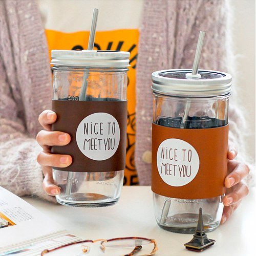 Стакан «Nice to meet you» Вот уж действительно большой стакан! Целых 600 мл против летней жажды В комплекте металлическая крышка, трубочка и кожаный чехольчик, благодаря чему получился очень удобный и стильный предмет! -------->