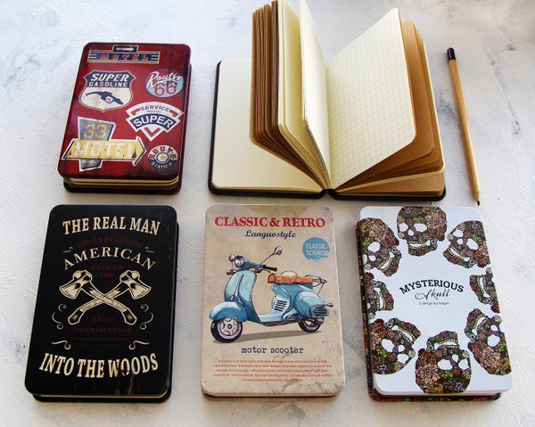 Такие стильные жестяные коробочки… на самом деле металлические блокноты! Действительно, очень оригинально и необычно. И оцените как практично для тех, у кого вечный хаос в сумке и в итоге потрепанный ежедневник — обложка из жести делает блокнот буквально «неубиваемым»! ------>