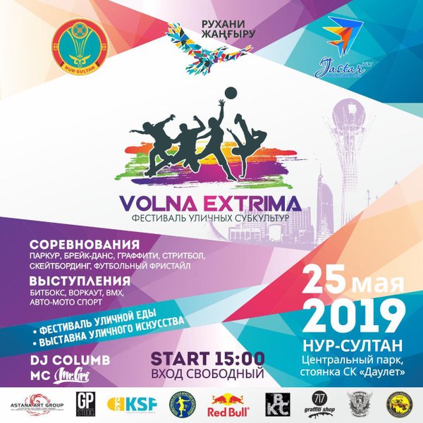 Ежегодный фестиваль уличных субкультур «Волна экстрима» пройдёт уже в эту субботу (25.05.2019) Дата: 25 мая Время: 15:00 Место: стоянка СК ”Даулет” Вход свободный Вас будут ждать призы от SPOT Boardshop Будет жарко