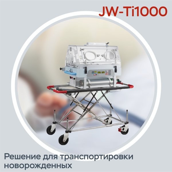 ает метаболический ацидоз, периферический спазм и гипогликемию. Последние факторы усиливают мозговой кровоток и могут спровоцировать развитие внутрижелудочкового кровоизлияния у недоношенных детей. Кроме того, патологическое воздействие может оказывать увеличивающаяся при холодовом стрессе потребность в кислороде, с последующей тканевой гипоксией. Так, у доношенного новорожденного при снижении окружающей температуры с 33 С до 31 С потребление кислорода удваивается, что, в свою очередь, требует удвоения альвеолярной вентиляции. Гипотермия способствует также развитию язвенно-некротического энтероколита. В настоящее время доказано, что даже не резко выраженная, но длительная гипотермия, повышая энерготраты для теплопродукции, нарушает тем самым рост ребенка. Транспортный инкубатор JW-Ti1000 предназначен для оказания регулируемой тепловой поддержки новорожденным, которые нуждаются в постоянном сестринском вмешательстве. Помимо этого инкубатор используется для защиты ребенка от воздействия прохладной среды во время транспортировки. Возможность отделения основного блока от тележки, предоставляет инкубатору полную автономность.