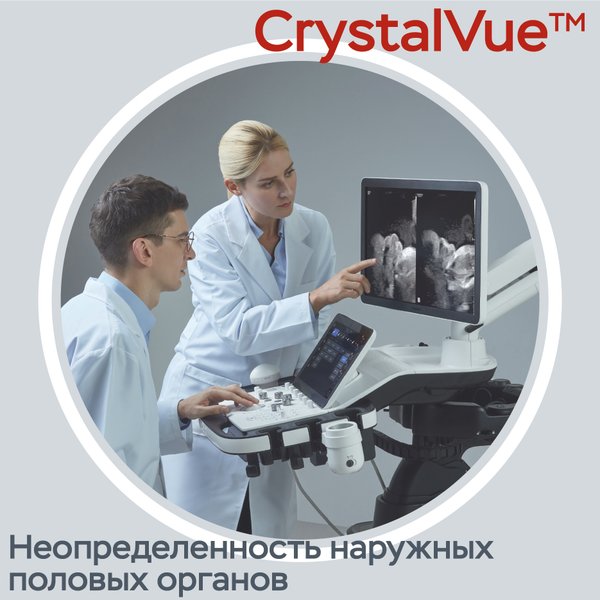 двумерного (2D) ультразвукового исследования во втором и третьем триместрах беременности; однако, трехмерное (3D) УЗИ во многоплоскостном режиме и режиме объемного преобразования позволяет обеспечить достаточную просматриваемость признака «тюльпана» в случаях гипоспадии. Дифференцировка между гипоспадией и гипертрофией клитора имеет важное значение, поскольку гипоспадия связана с мальформациями верхних отделов мочевыводящих путей, а также крипторхизмом и паховыми грыжами. Гипертрофия клитора может носить временный характер ввиду попадания материнских гормонов в организм плода. Применение новой методики CrystalVue™ (HS40, HS60, Hera W10 от Samsung Medison), в основе которой используется эффект освещения от селективного источника света для достижения реалистичной объемной визуализации анатомии плода, позволяет подтвердить гипертрофию клитора, несмотря на признак «тюльпана», выявленный по результатам 2D-ультрасонографии. Технология CrystalVue™ обеспечивает достаточную дифференцировку между границами мягких тканей и анатомическими структурами и позволяет получать точные изображения оптимального качества.